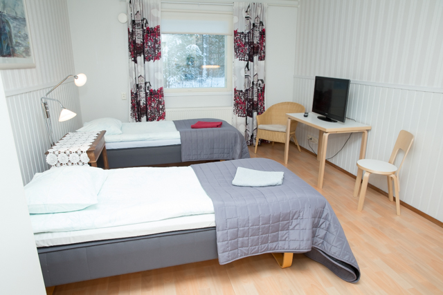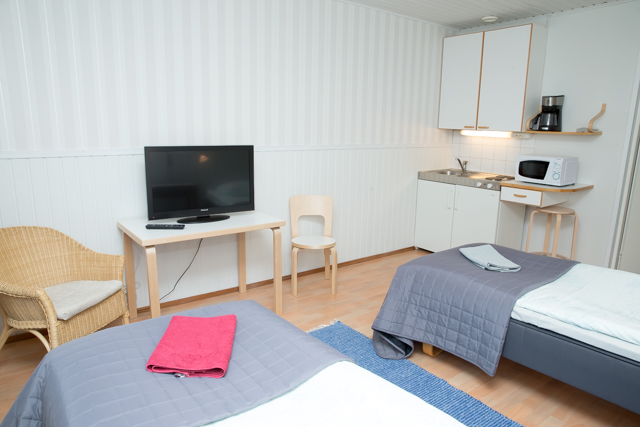 Majoitusrivitalostamme löytyy myös kymmenen yhden hengen huonetta, joista jokaisesta löytyy oma wc, suihku, jääkaappi, tv ja langaton nettiyhteys.